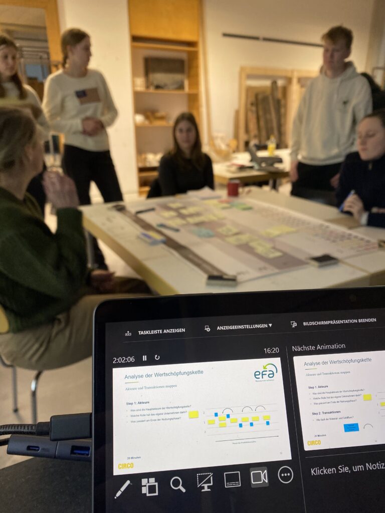 Durchgeführt hat die Workshops die Effizienz-Agentur NRW (efa) an drei Nachmittagen auf Basis des Circo-Tracks, der punktuell übernommen und angewendet wurde. Ziel war es, gemeinsam zirkuläre Ansätze und mögliche Potenziale der Wertschöpfungsketten zu finden, um daraus neue Geschäftsmodelle und -konzepte zu entwickeln – praxisnah, interdisziplinär im direkten Austausch zwischen Wissenschaft, Verwaltung und Unternehmen.